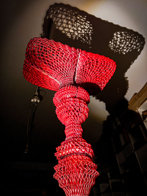 Altare Primordiale is one of the artist’s earliest and most ambitious modular constructions—an ancestral table-sculpture resembling a ceremonial relic from an imagined ancient ecology. Composed of stacked lattice segments, its form rises as an organic column, culminating in a chalice-like surface that suggests both functionality and ritual presence.