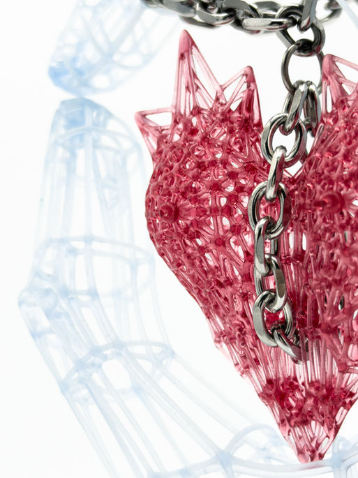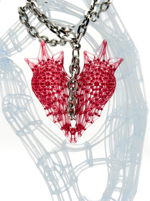 Corpus Cordis is a small-scale parametric wearable sculpture that can be worn as an earring, charm, pendant, or placed simply as an object of contemplation. Its form merges the silhouette of a female torso with a spiked, heart‑like geometry, creating a hybrid between anatomical reference and symbolic emotion. The ribcage and chest are subtly embedded within an intricate mesh that radiates outward, giving the piece the appearance of a protective yet vulnerable organ—both bodily and abstract. Its dual structure, split symmetrically and connected at the center, suggests a heart opening or doubling, embodying themes of intimacy, strength, and transformation within a compact sculptural form