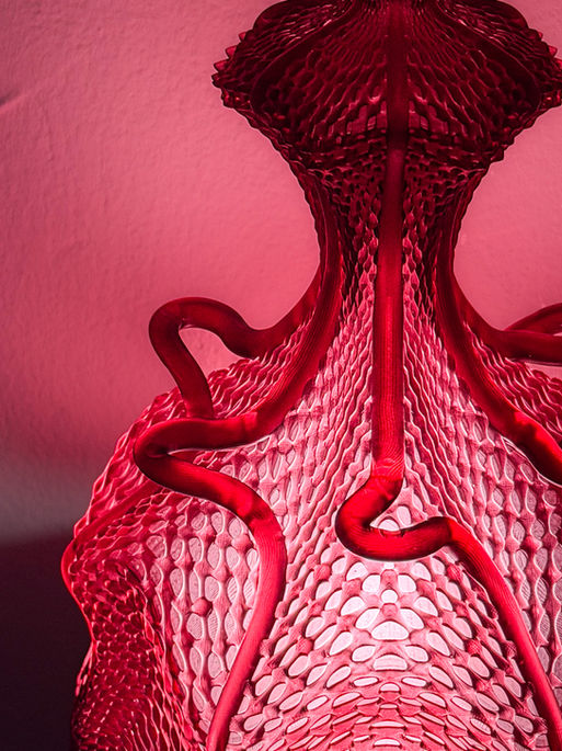 Inquilina protecta is a mounted lighting sculpture composed of a central organism surrounded by six peripheral entities that grow in close interdependence. Each body develops its own formal language while remaining structurally bound to a shared system of support and protection. The outer elements act as shielding wings, while the central body functions as both anchor and mediator between the living structure and its metal base. At its apex, the core organism enters a flowering phase, unfolding into an expanded form that suggests a seasonal cycle of growth, exposure, and renewal, transforming the sculpture into a momentarily blossoming entity suspended between animal morphology and botanical emergence.
